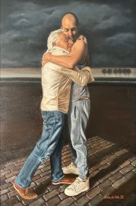 Marian en ik vonden onze vriend Paul van Dormael en zijn jongste zoon Daniël bereid om voor ons te poseren. Zij hadden ook een verhaal. Hun familieleven was om allerlei redenen zwaar beproefd. Eén daarvan was dat Daniël tijdens wintersport een herseninfarct kreeg. Hij overleefde en kon door zijn vader omhelsd en gekust worden. Wel raakte hij rechts verlamd, daarom zie je op ons schilderij zijn rechterarm niet.