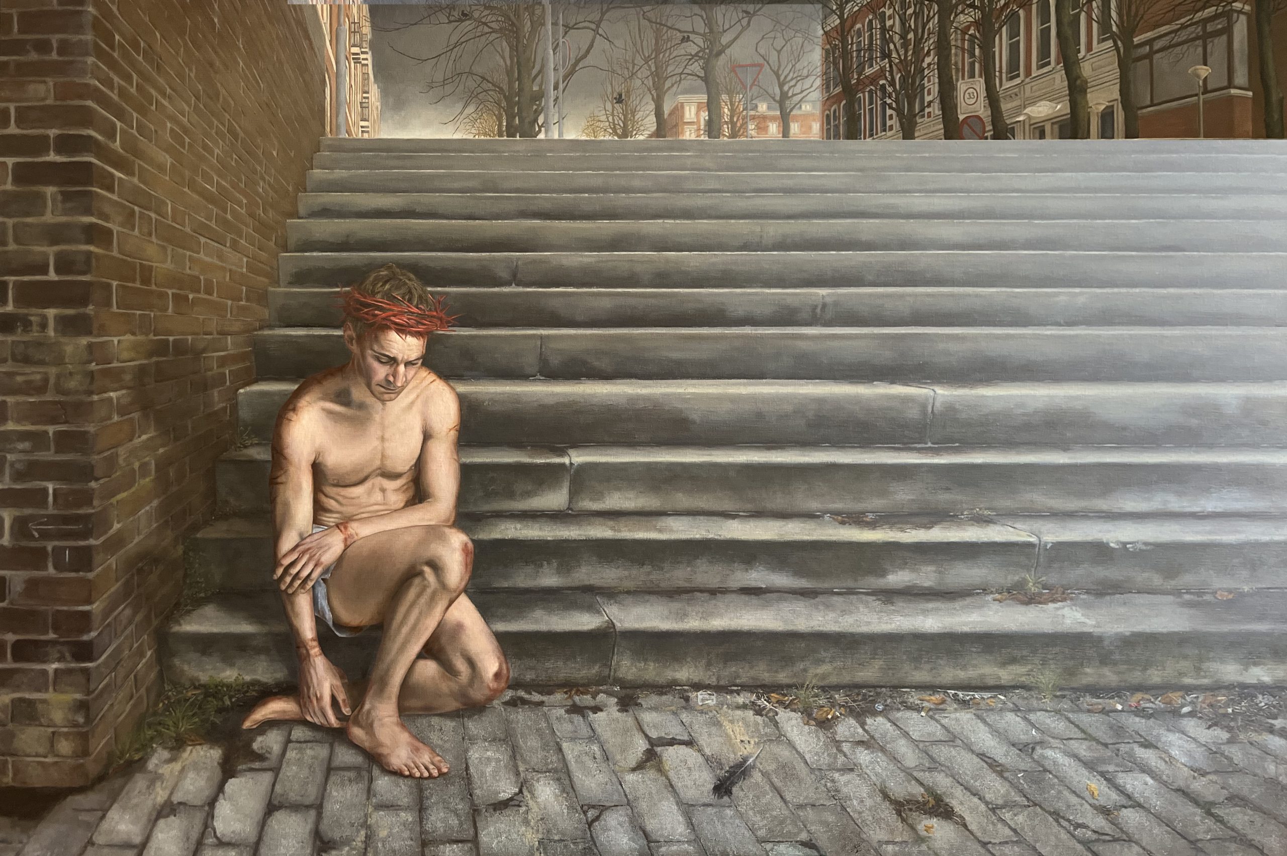 De voorstelling Christus op de koude steen stamt uit de Nederlandse Middeleeuwen.** Ik heb er lang op zitten broeden hoe we dit thema in onze tijd en omgeving konden plaatsen. De inspiratie vonden we dicht bij huis. Telkens als ik een rondje Noordereiland liep (onze woonplek) bleef ik staan bij de trap om het voor me te zien. Toen ben ik gaan schetsen, eerst op papier, daarna op doek.